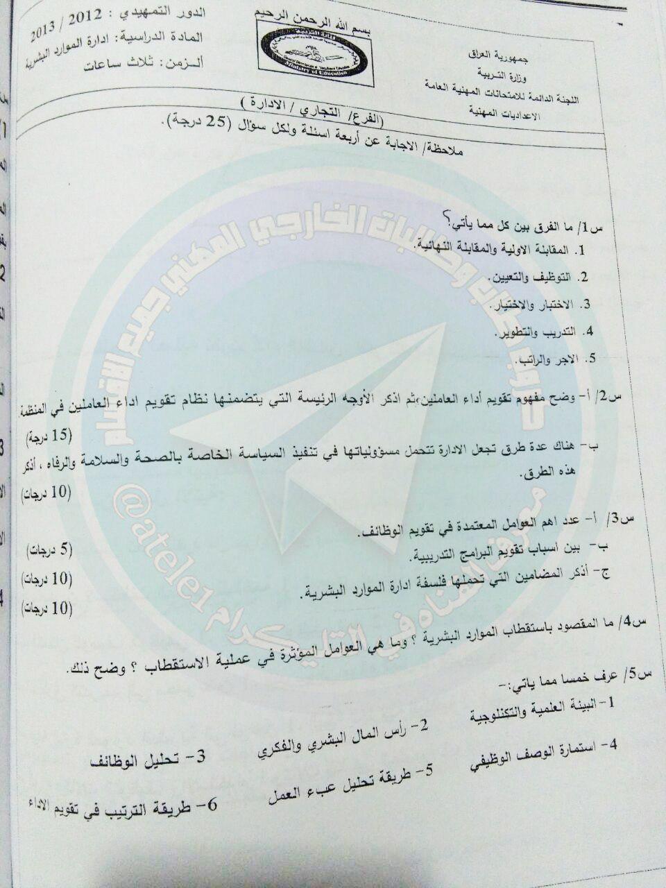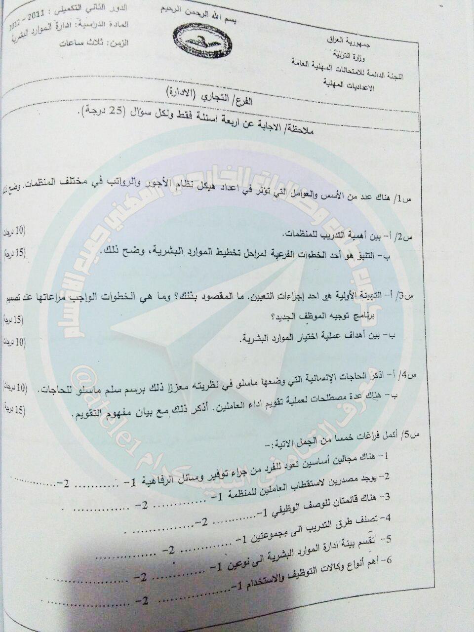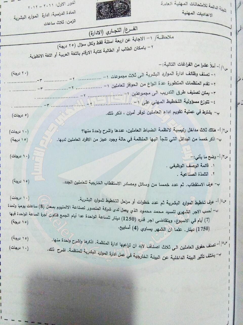 اسئلة السادس المهني مادة ادارة موارد البشرية الدور الثاني 2017 هاشتاك نت