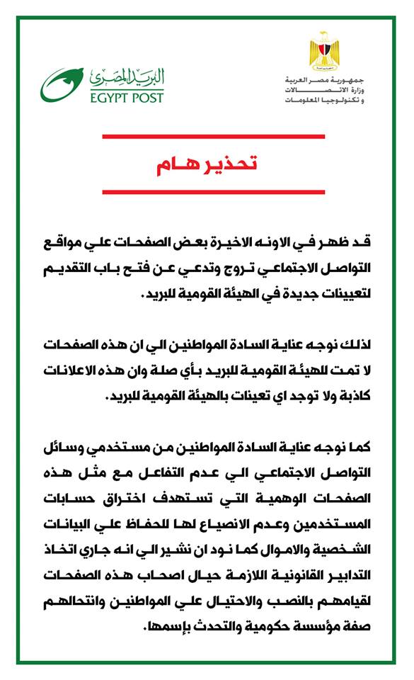 بيان هام بخصوص وظائف الهيئة القومية للبريد المصري المعلن عنها الكترونيا منشور بتاريخ 13 يونيو 2019