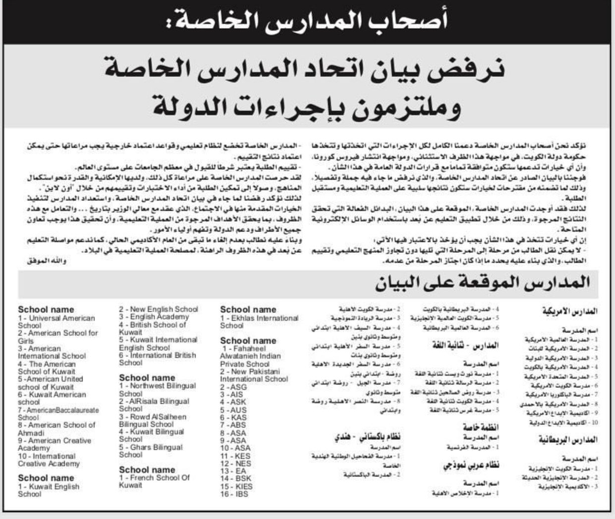 ماضي الخميس On Twitter أغلب اصحاب المدارس الخاصة في الكويت أصدروا بيان يعترضون فيه على مطالب اتحاد المدارس الأهلية الذي تقدم بطلبات استغربها أغلب الشعب وأولياء الأمور في هذا التوقيت وجعل