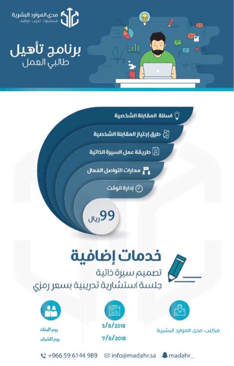مدى الموارد البشرية A Twitter برنامج تأهيل طالبي العمل إذا كنت خريج أو حتى باحث عن عمل يساعدك البرنامج في معرفة اسرار المقابلة الشخصية الناجحة و مهارة كتابة السيرة الذاتية و بعض