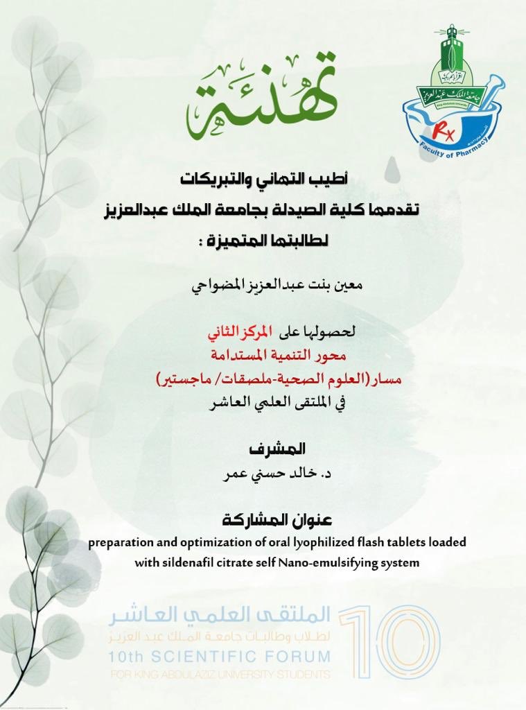كلية الصيدلة بجامعة الملك عبدالعزيزさんのツイート الملتقى العلمي العاشر Kau تهنيء كلية الصيدلة طالبتها معين المضواحي ومشرفها المتميز لحصولها على المركز الثاني مسار العلوم الصحية ملصقات ماجستير في الملتقى العلمي العاشر نسأل الله لها دوام التوفيق والتميز