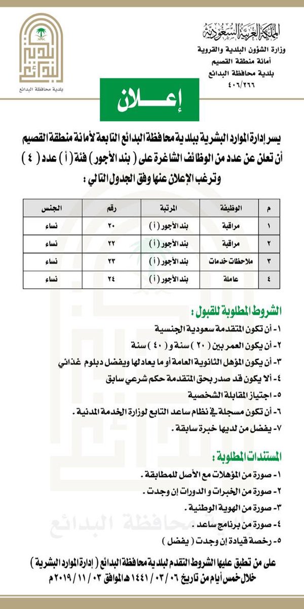وظائف للسعوديين V Twitter تعلن بلدية البدائع التابعة لامانة القصيم عن توفر وظائف للنساء علي بند الأجور 1 مراقبة 2 مراقبة 3 ملاحظات خدمات 4 عاملة يبدأ التقديم الاحد