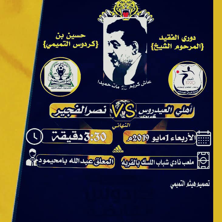 اليوم الأربعاء نهائي بطولة فقيد حضرموت الشيخ حسين بن كردوس لكرة القدم اهلي العيدروس يواجه النصر بالفجير المواعيد بطاقة المباراه صدى حضرموت الإخبارية